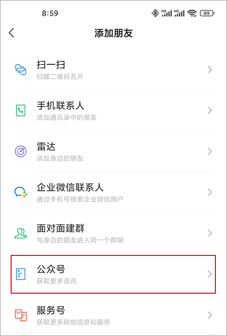 2、扫描公众号海报、名片或服务窗口提供的二维码;