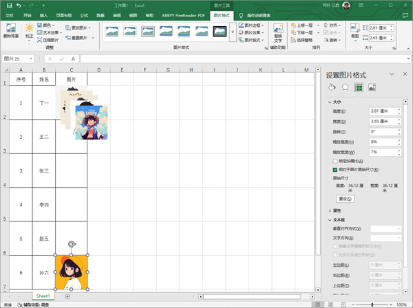3、按“Ctrl+A”全选表格中图片,在图片上单击鼠标右键中点击“大小和属性”,打开“设置图片格式”对话框。取消“锁定纵横比”前面的勾号。调整“高度”、“宽度”,使图片和单元格大小一致。