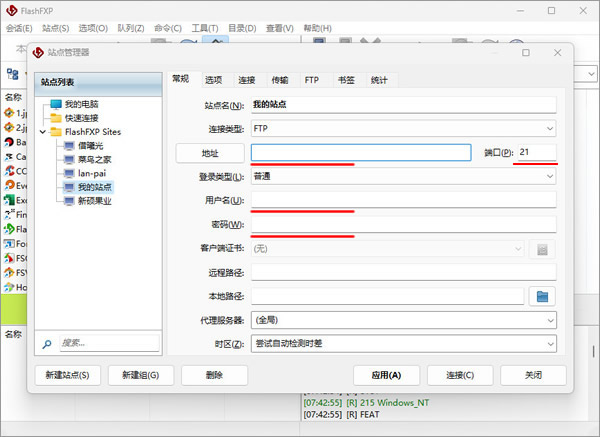 3、在常规选项卡下,输入FTP空间的IP地址,端口,用户名称,密码,然后点击“应用”按钮,站点就设置好了;