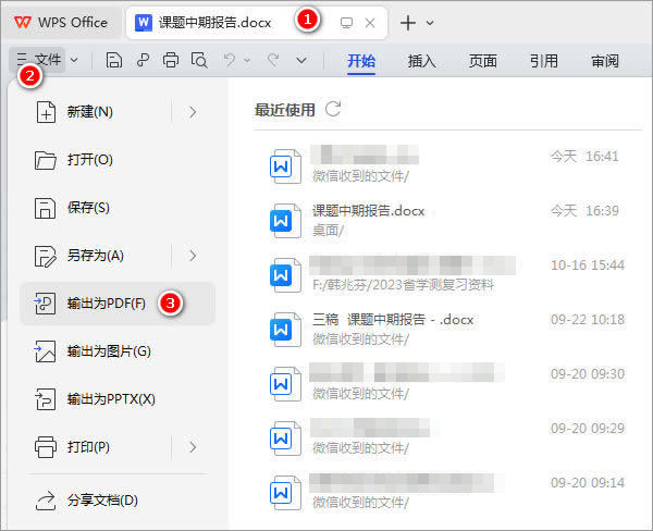 1、运行WPS办公软件,打开课题中期报告.docx文档,点击“文件”,在下拉菜单中选择“输出为PDF”到指定目标位置;