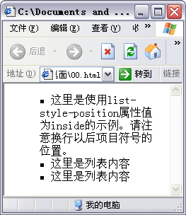 <li>这里是使用list-style-position属性值为inside的示例。请注意换行以后项目符号的位置。</li>