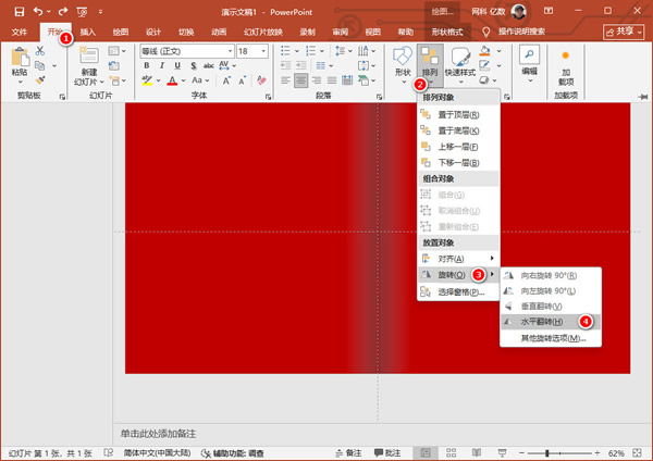 4、复制该矩形粘贴在参考线的右侧,在“开始”菜单中选择“排列”-“旋转”-“水平翻转”,这样就做出来书本摊开的逼真效果;