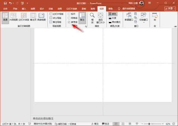 1、在新建的空白PPT中,在“视图”菜单中,勾选“参考线”;