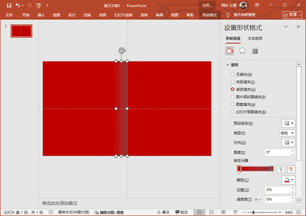 3、插入一个狭长矩形,右边与中线对齐,接着对其设置渐变填充,方向:线性向右,左边色标与页面颜色一致,右边颜色更深一点,去掉边框线条;