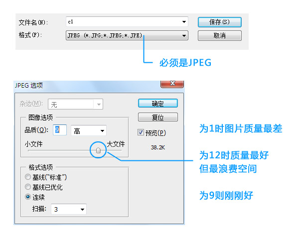 最后一步,保存。保存的时候选择“存储为...”或“保存为...”,可以填写更多保存信息。最关键一步,保存的时候必须选择保存格式为JPEG格式。否则有些图片默认保存为PSD格式则不能上传到网络。然后在弹出的JPEG选项中,图像质量选9,其它默认即可。