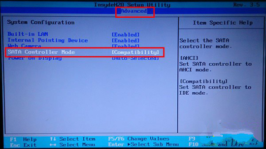 2、此时在advanced界面中查看sata controller mode项是否为"ahci",如果是ahci请按F10保存并对出,否则,按回车键执行,如下图: