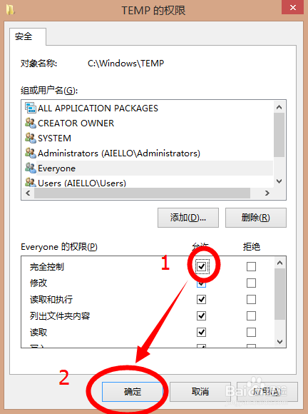 弹出对话框后选择“添加”,在对话框中输入“everyone”,点击右边的“检查名称”,然后选择“确定”。