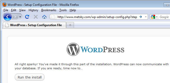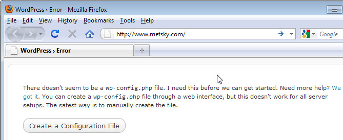 下面以WordPress 3.0英文版为例介绍安装过程(WordPress中文版操作步骤完全相同)。输入域名访问后,提示如下图,由于缺少配置文件,所以需要创建(当然也可以手动修改wp-config-sample.php,然后另存为wp-config.php一同上传上去,那么安装会更简单,新手还是按照下面的顺序安装,以后熟悉了尝试),只需点击创建配置文件(Create a Configuration File)进入下一步:
