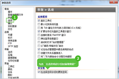 2、在参数选择界面,点击左侧的【选项】,然后勾选右侧下方安全性下的“在选择密码字段时展现密码”。