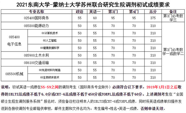 2021东南大学-蒙纳士大学苏州联合研究生院调剂初试成绩要求