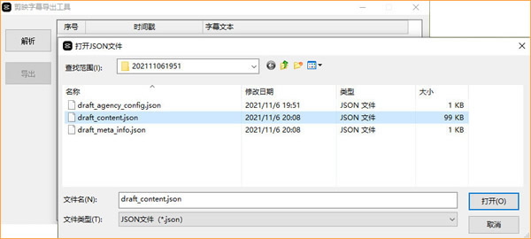 首先点击“解析”打开草稿目录(图二红线标注的地址),一般情况下能够自动识别这个文件夹,如果小工具没有自动识别到com.lveditor.draft文件夹,可直接搜索com.lveditor.draft,然后根据文件夹创建时间,找到最新识别的字幕打开。