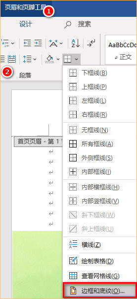 2、在“页眉和页脚工具”菜单里点选“开始”,找到“段落”里的“边框”,点击下拉菜单选择“边框和底纹”,在边框标签上选择“无”,应用范围为“段落”。