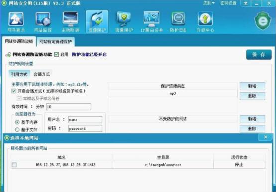 网站安全狗防盗链功能具体防护方式有引用方式和会话方式两种防护方式,两种方式均支持跨服务器,用户可根据自己网站的需要自行选择使用哪种方式。该功能可以针对不同站点设置防盗链的过滤, 防止图片、软件、音乐、视频资源被人盗链。