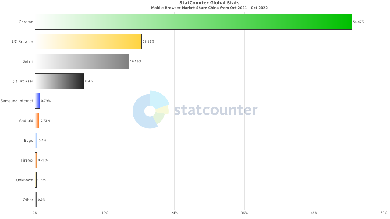 根据国际知名网站statcounter发布的统计信息,我们可以了解到直至2022年10月谷歌浏览器在国内电脑端、全球电脑端、国内手机端以及全球手机端市场应用占比情况,足见Chrome浏览器之强。