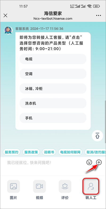 在会话窗口,点击输入框后面的“+”,选择“转人工”,发起请求,将电视机的有线网卡MAC地址发送给客服人员,等待处理。